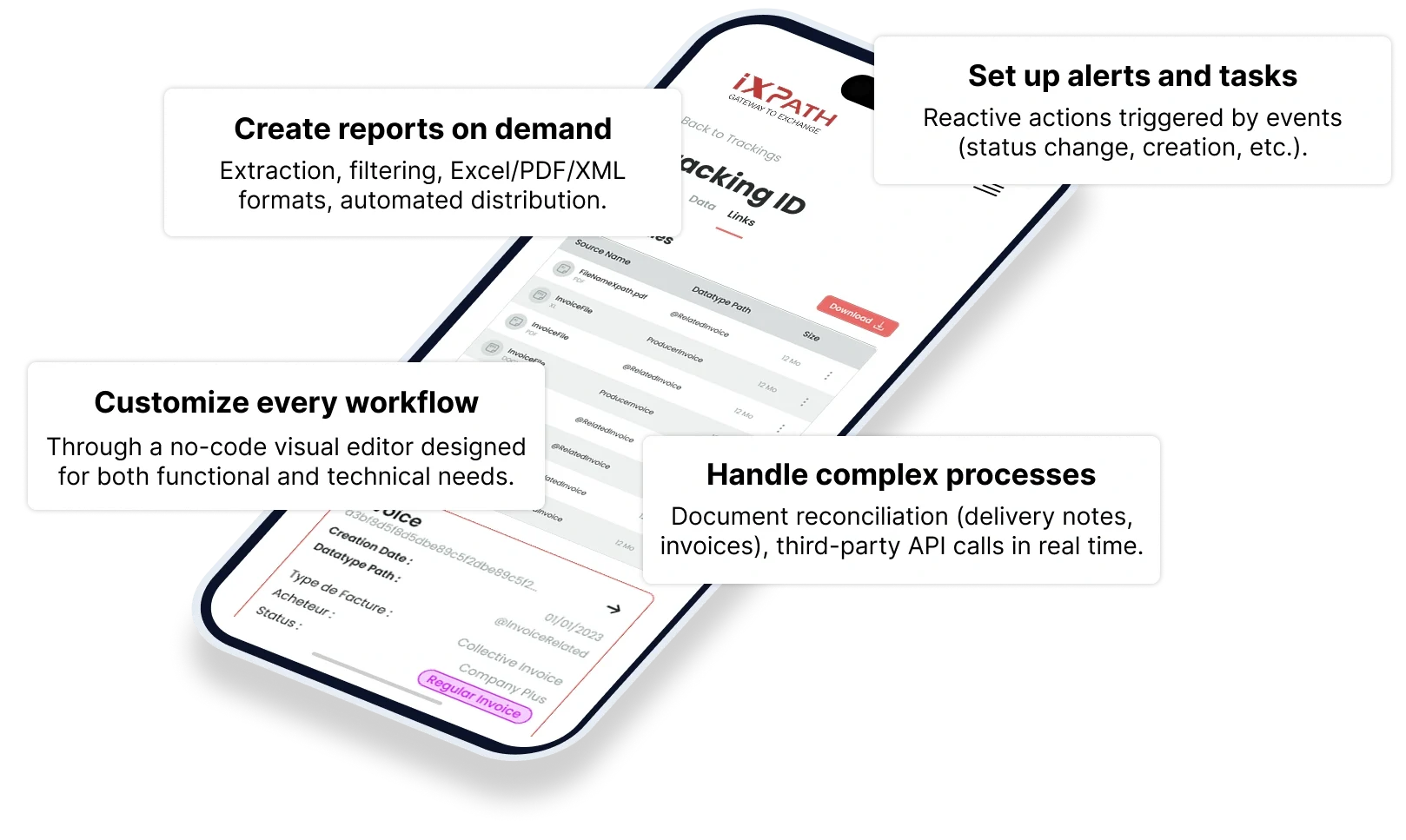 iXPath provides personalized flow monitoring for each user, tailored to their business needs. Searches can be performed easily using functional criteria (order number, customer code, date, etc.) for clear and quick analysis.